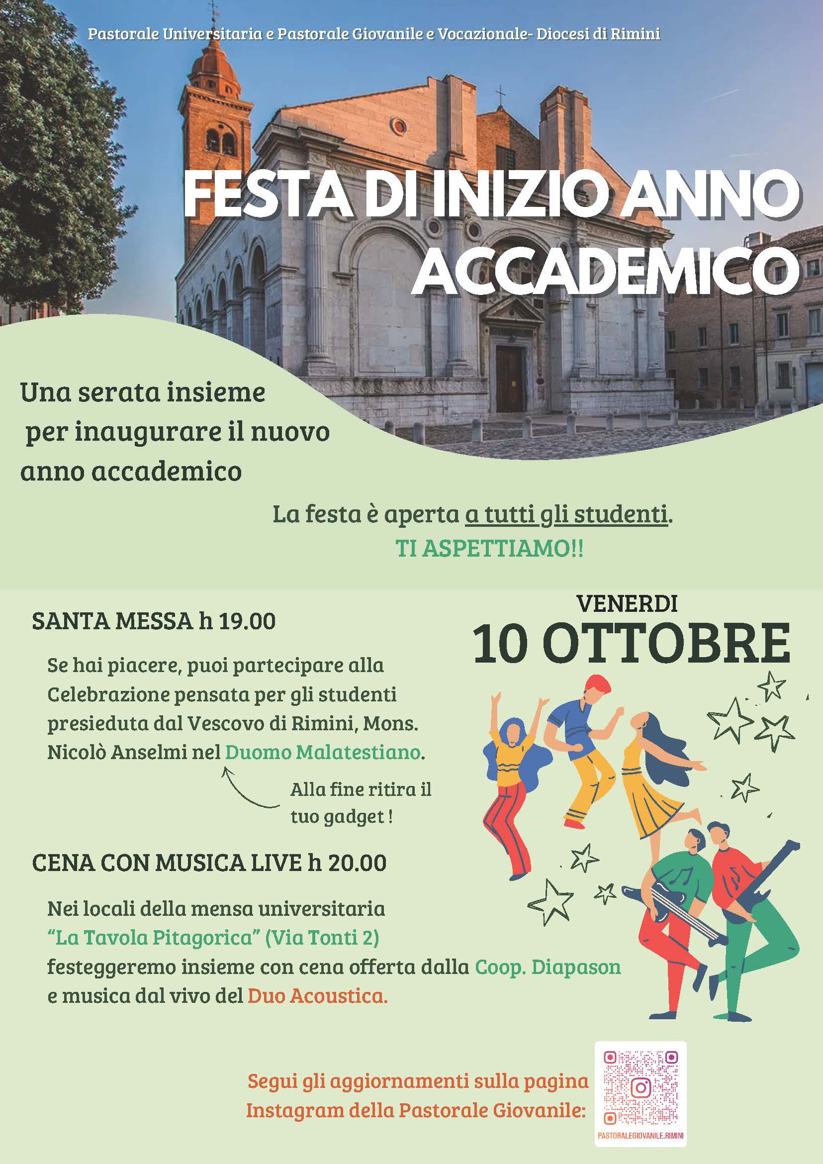 VENERDI’ 10 OTTOBRE  –  Ore 17.30-18.30 Presso la Chiesa della Mater Misericordiae Adorazione Eucaristica; durante l’Adorazione recita del Rosario; ore 18.30 S.Messa   –  Ore 19.00 presso Cattedrale S. Messa e festa inizio anno per la comunità universitaria, a seguire cena ore 20 nel cortile della Cattedrale (o mensa universitaria in caso di pioggia) vedi anche QUI